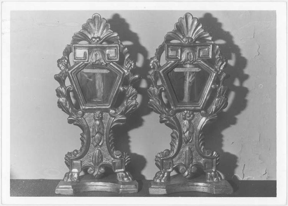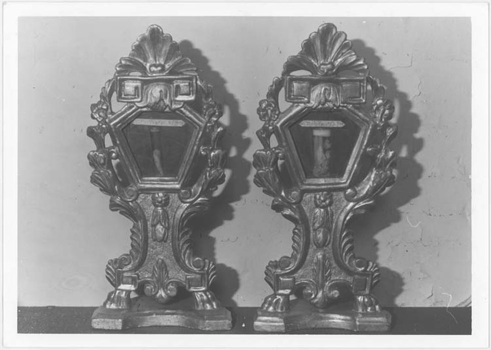 Reliquaires pédiculés à socle pyramidal. Ils ne sont décorés que sur une seule face. Pour quatre d'entre eux, la monstrance, ovoïde, est encadrée d'acanthes et de volute. Elle est surmontée d'un petit dais couronné par une petite coquille. Quatre autres reliquaires possèdent un piètement de pattes de lions, surmonté de deux consoles inversées. La monstrance occupe un cartouche hexagonal encadré de feuilles et surmonté d'une coquille frontale. Deux paires conservent les reliques des saints Justine, Domitille, Pie Ier et Cécile. Deux autres paires conservent les reliques des saints Poplycarpe, Boniface, Siméon et Marcel et une paire conserve les reliques des saints Magne, Gervais et Protais.