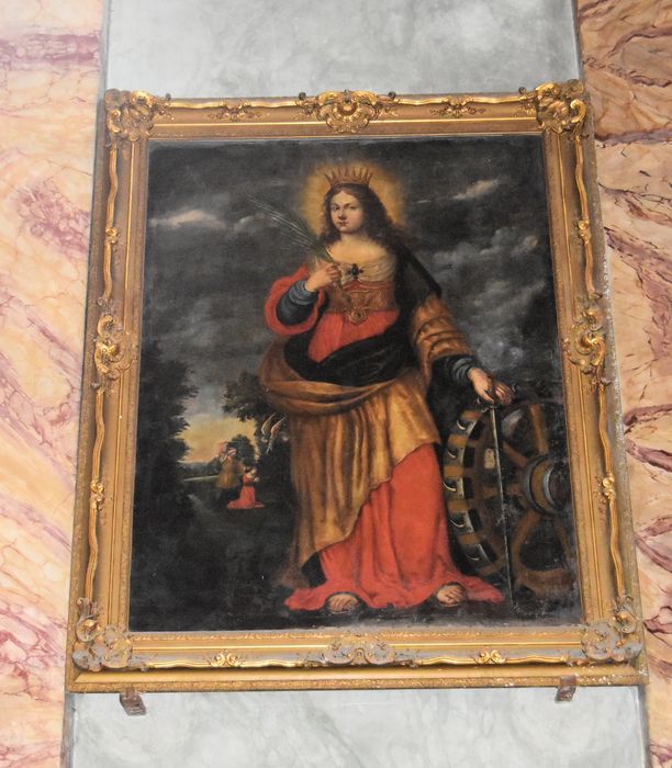La sainte est debout, couronnée et entourée de ses attributs : palme du martyre, roue et épée. La scène de sa décollation est représentée au fond à gauche dans un paysage bucolique.