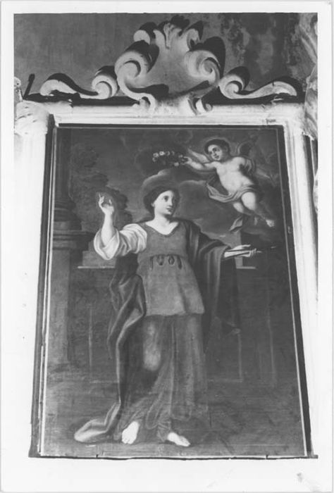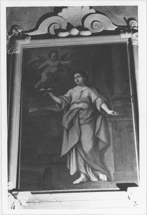 L'encadrement de gypserie comporte une grande coquille pour Sainte Agathe et un cartouche pour Sainte Apolline.
