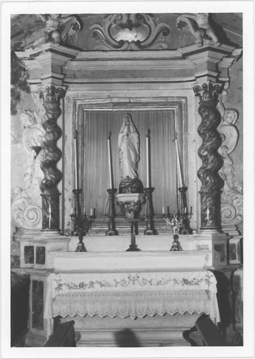 Autel-tombeau surmonté d'un retable à colonnes torses peintes en faux marbre et flanquées de volutes et d'angelots.