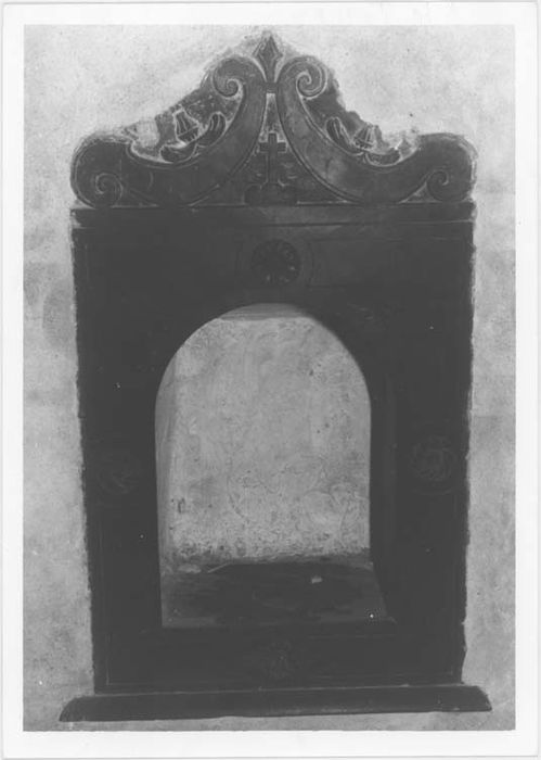 Niche creusée dans le mur avec un encadrement sculpté en ardoise grise de Haute Ligurie. Deux piédroits ornés de rosaces supportent un entablement couronné par un fronton à volutes.