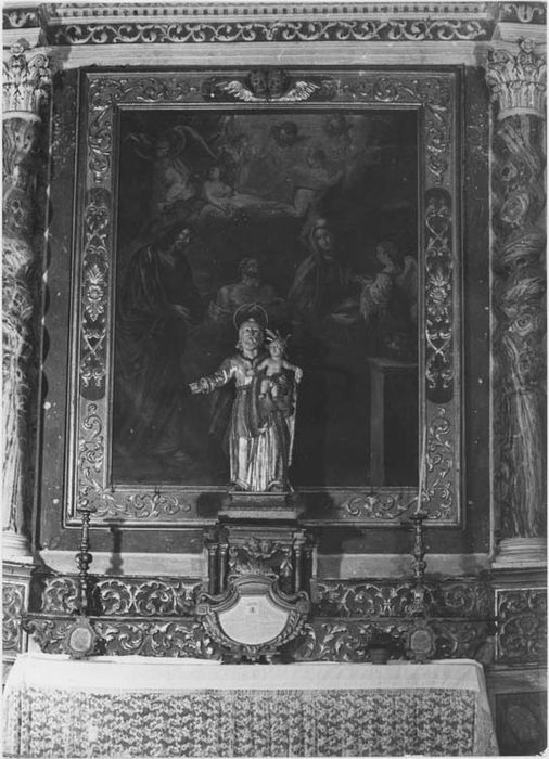 Retable à colonnes aux fûts torsadés dans leurs parties supérieures et fronton brisé. Les gradins de l'autel et le tabernacle sont ornés de rinceaux dorés et digures d'angelots.