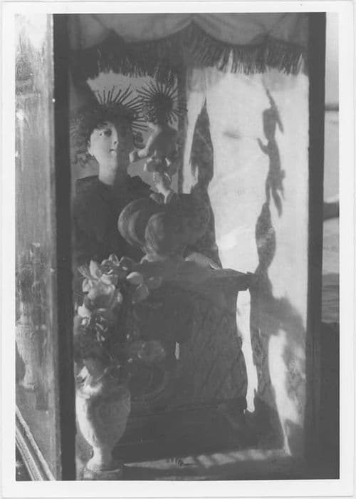 Figurines en cire et étoffes dans un coffret-vitrine.