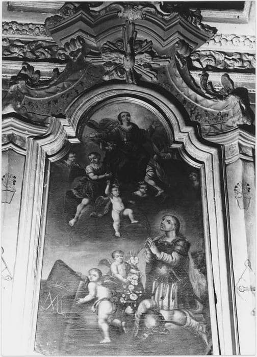 Le saint est agenouillé, les mains jointes, en tenue de soldat romaine. Des angelots déposent des bouquets de fleurs à côté de lui.
