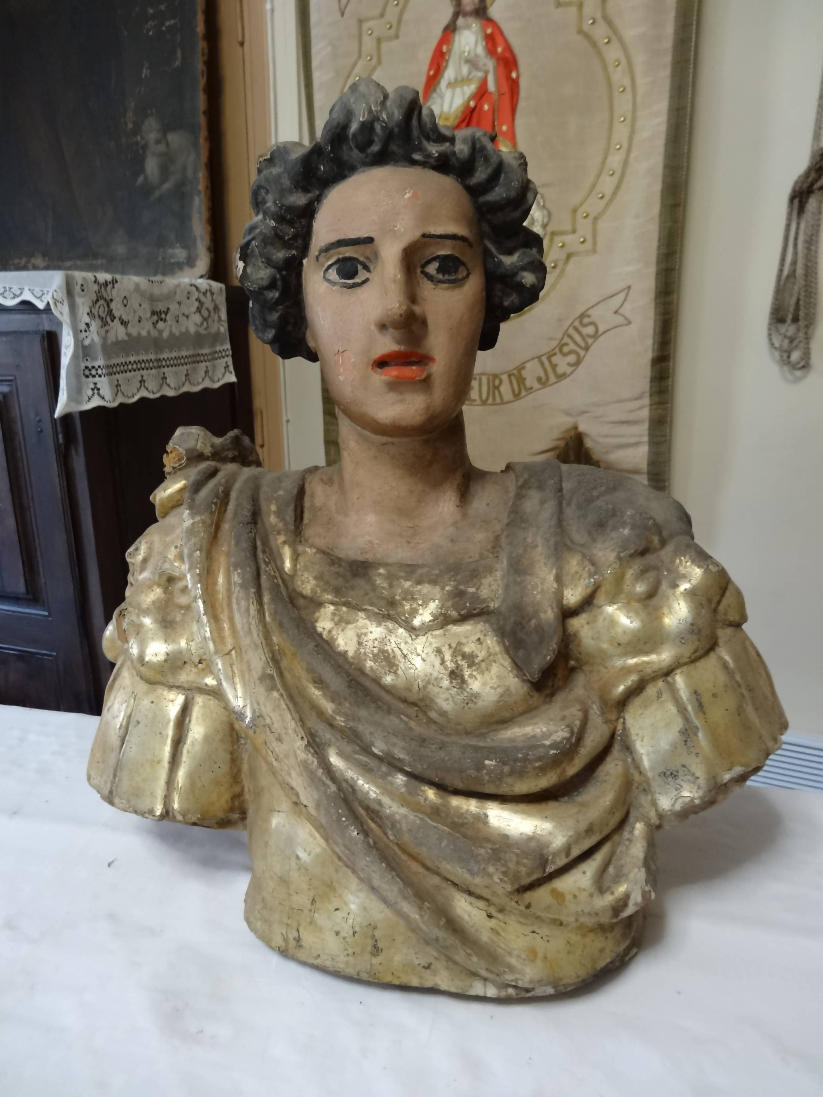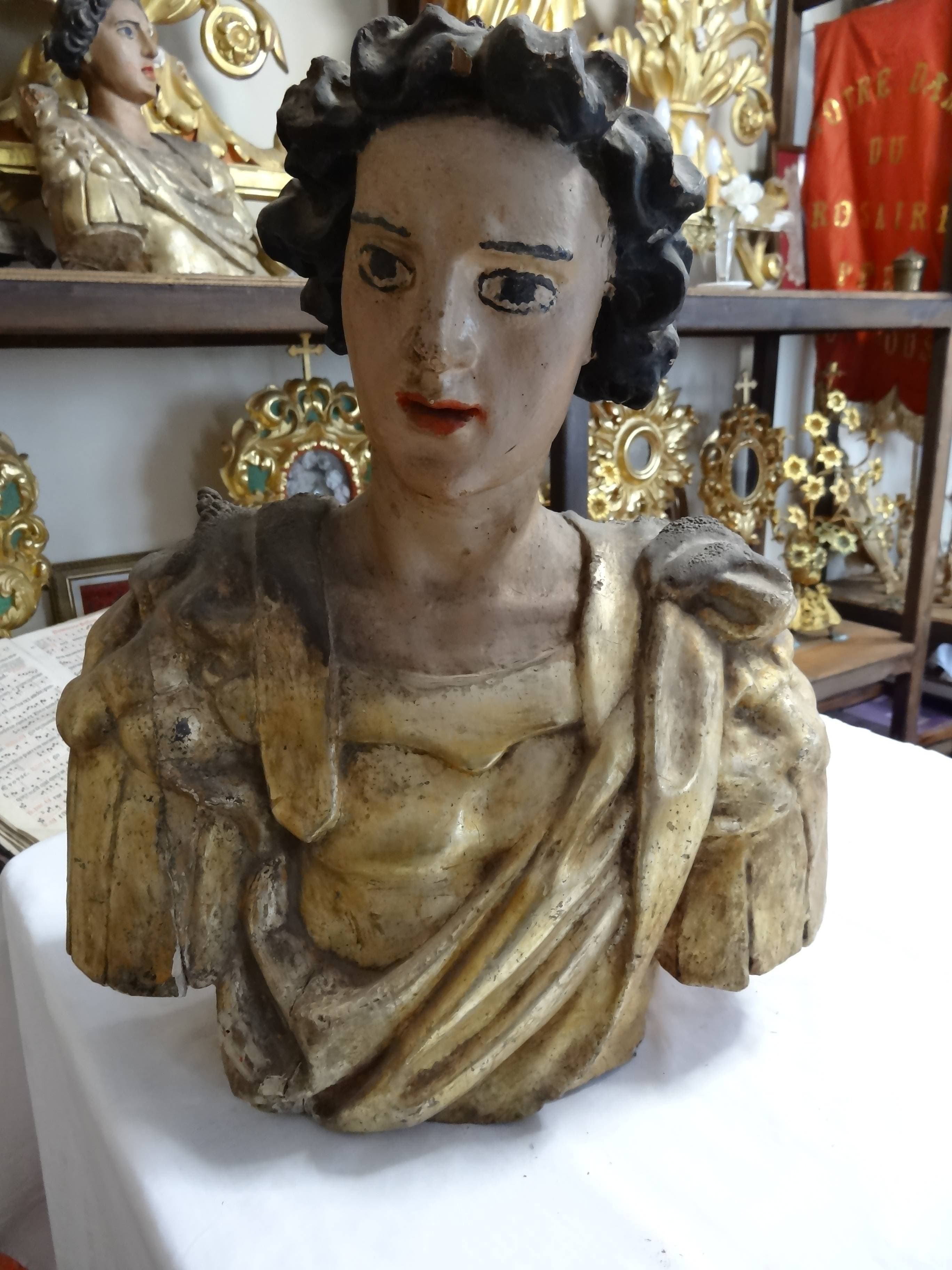 Bois en partie sculpté, polychromé, argenté et doré. Bustes jumelés pour être disposés en vis-à-vis.