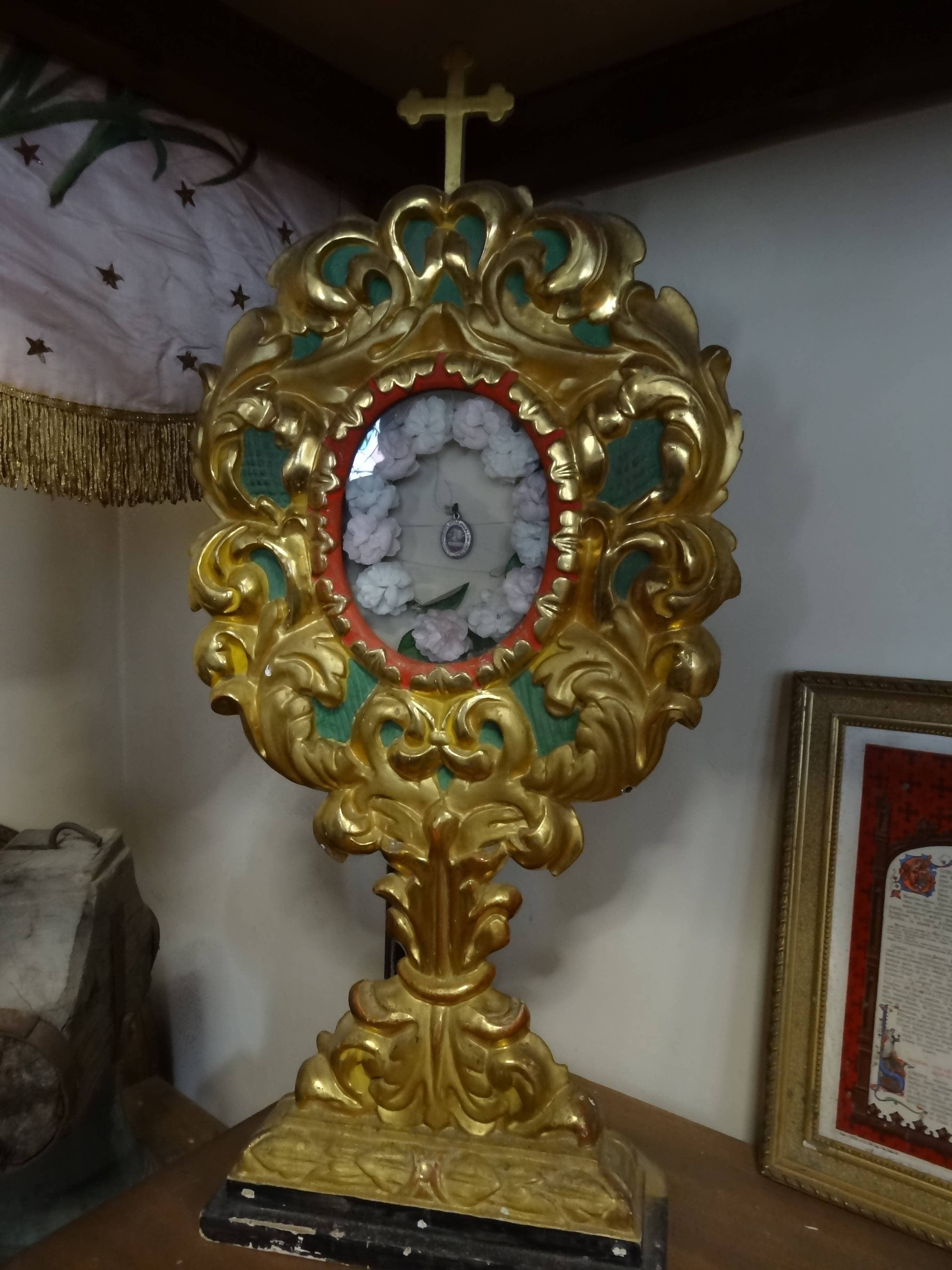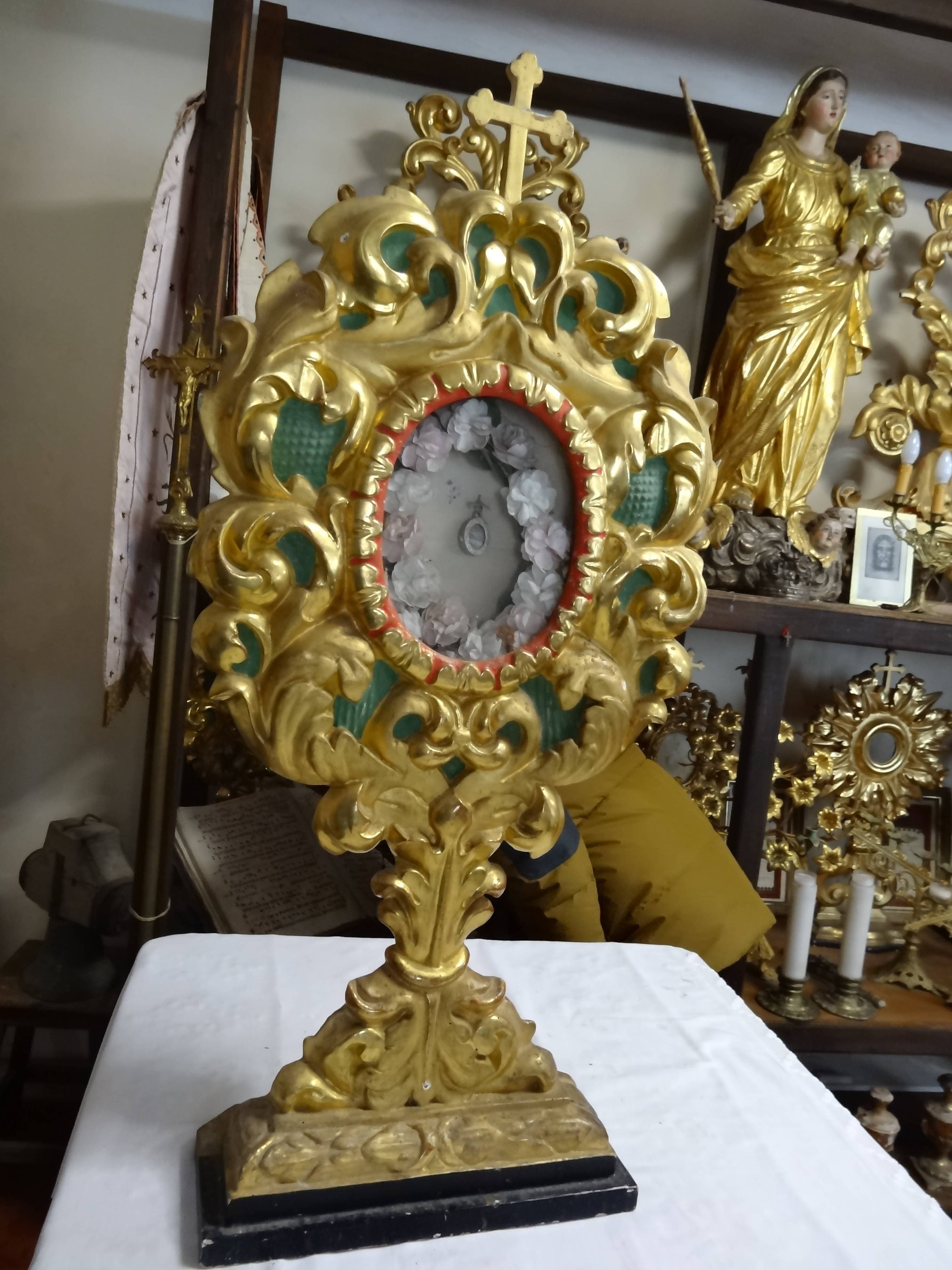 Reliquaires avec monstrances richement encadrées dans le style baroque. Bois en partie sculpté et doré à la feuille. Fonds peints de laque verte.