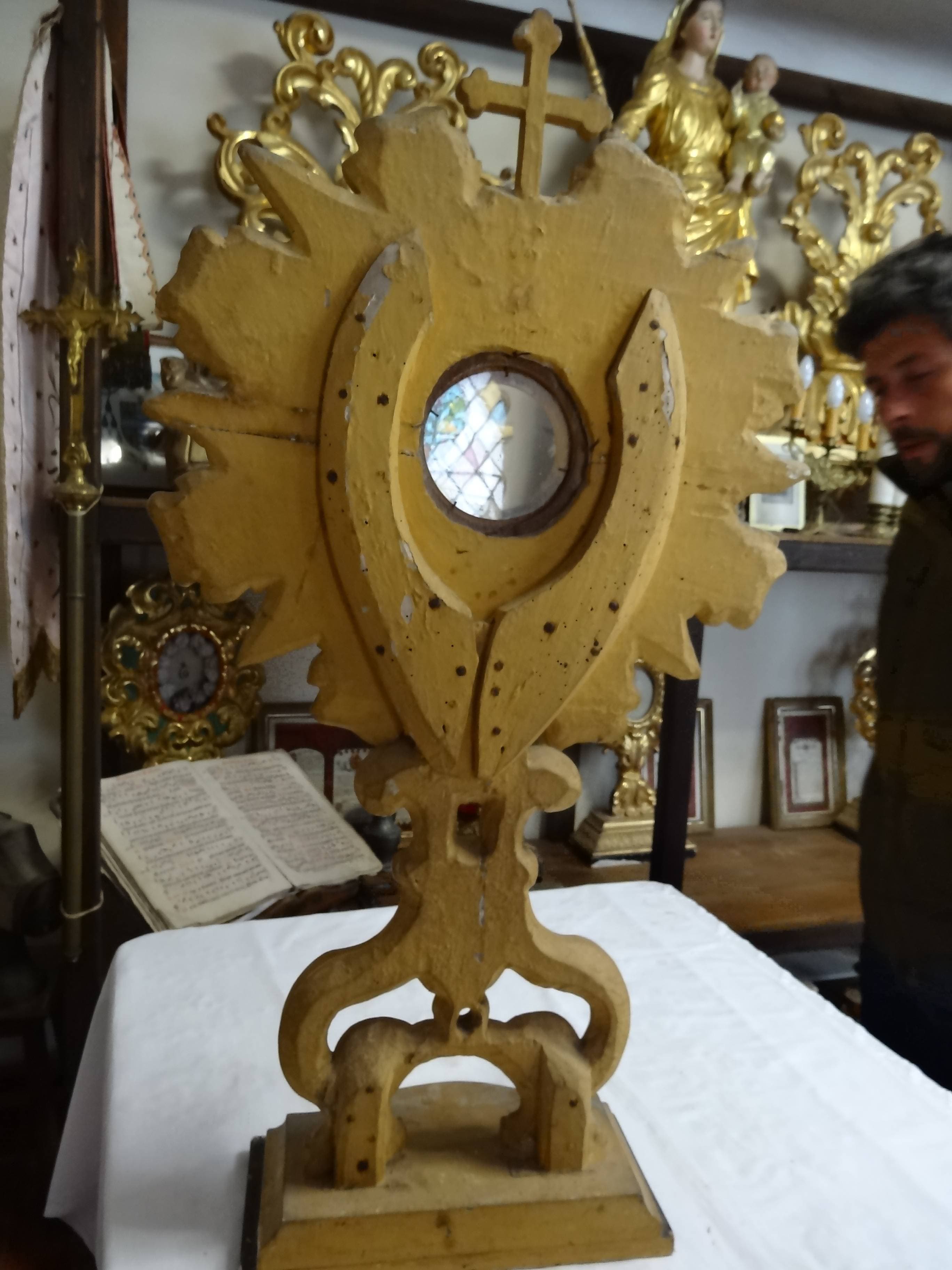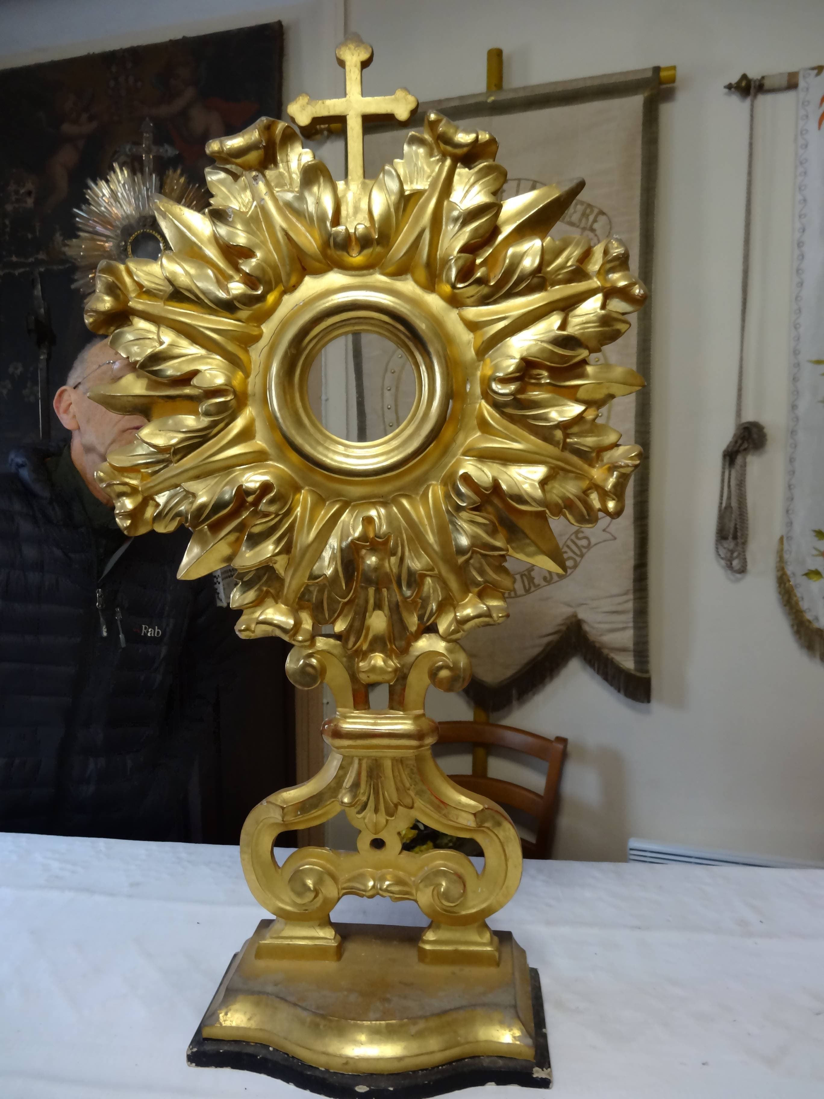 Bois en partie sculpté et doré à la feuille, assemblage avec clous de fer forgé. Socle tripode à face rehaussée de volutes. La monstrance à vue circulaire est décorée de rayons et de feuillages.