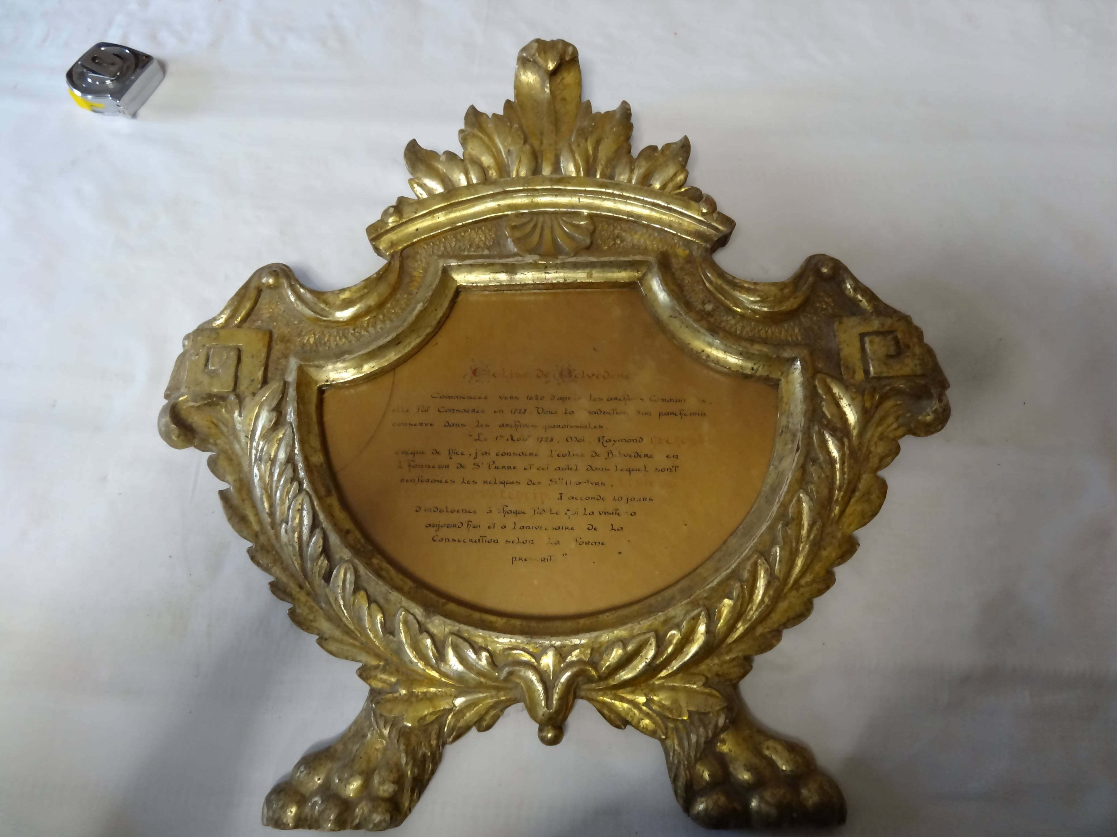 Bois en partie sculpté, argenté à la feuille puis doré à la gomme-laque, cadre sous verre.