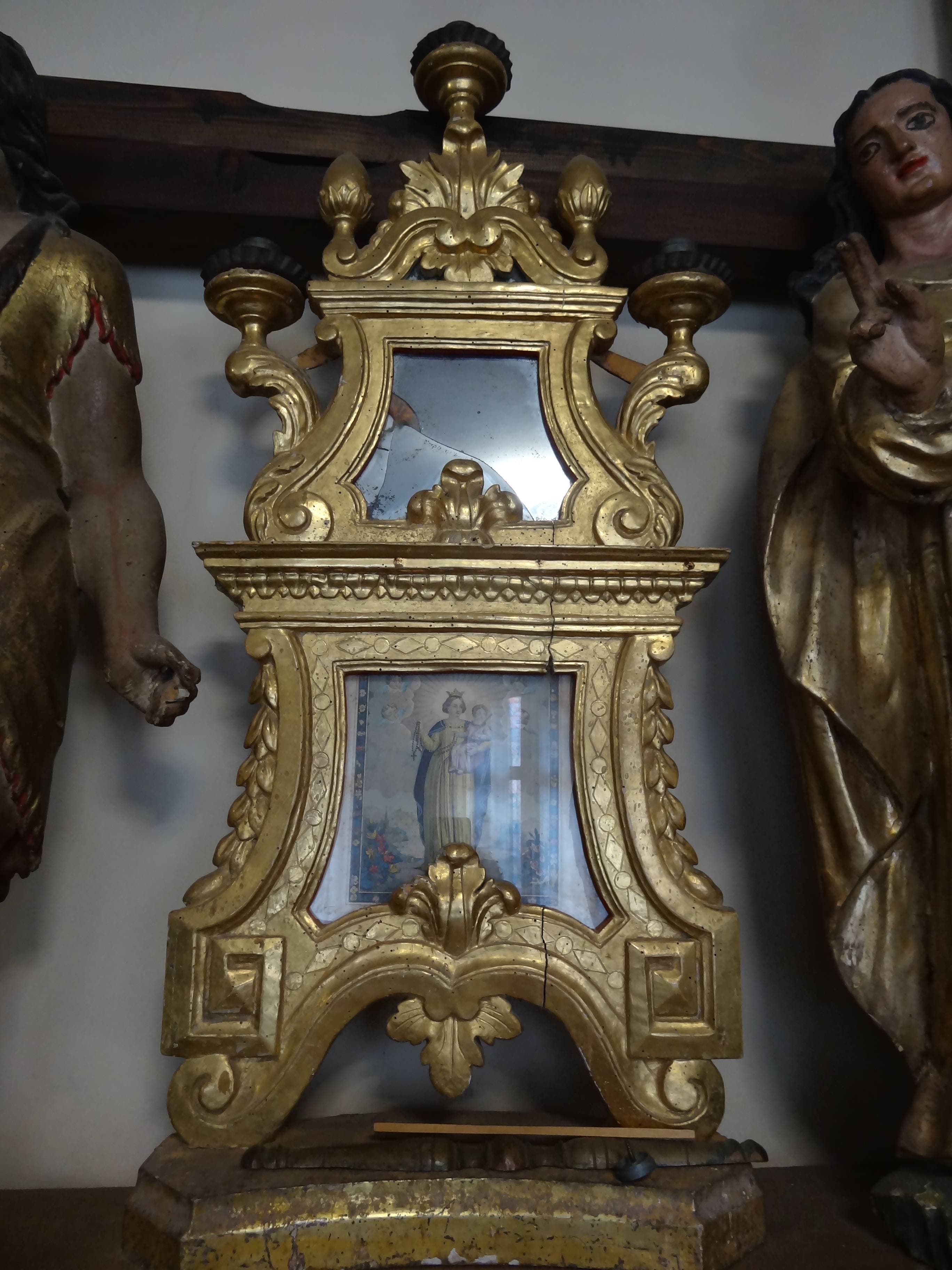 Deux panneaux à bords chantournés et miroirs munis de 3 flambeaux chacun avec deux gravures en taille douce figurant Notre Dame du Mont Carmel et Notre Dame du Rosaire.