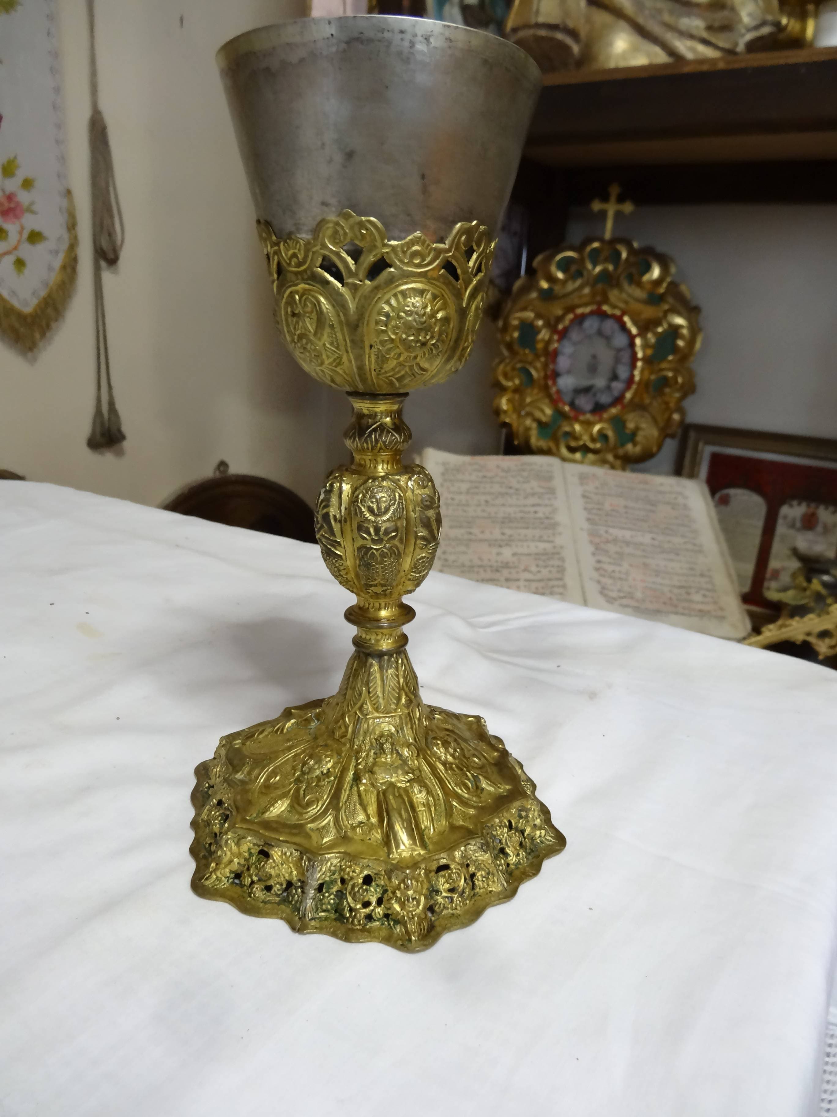 Patène moderne en cuivre doré, coupe du calice en argent.