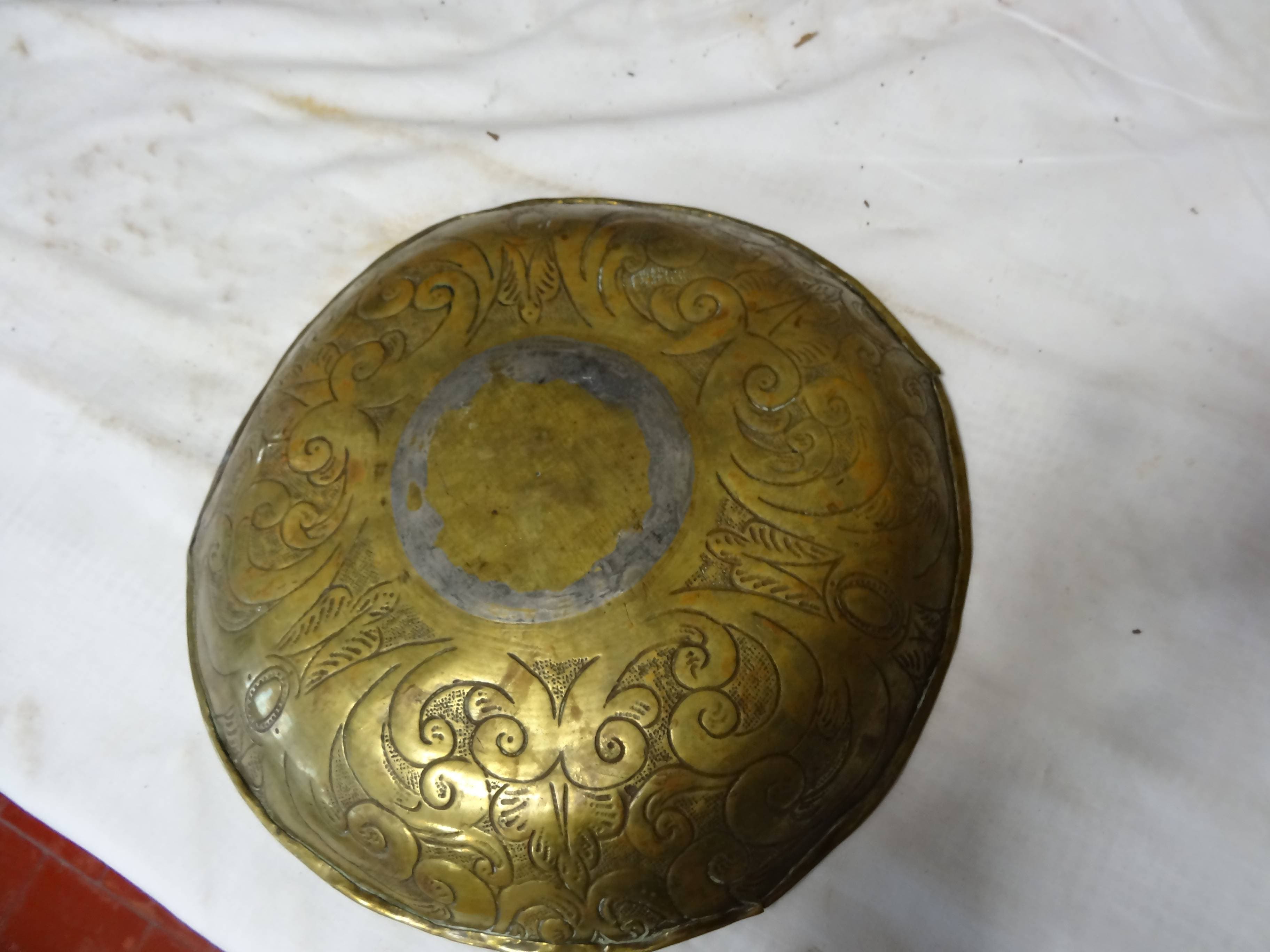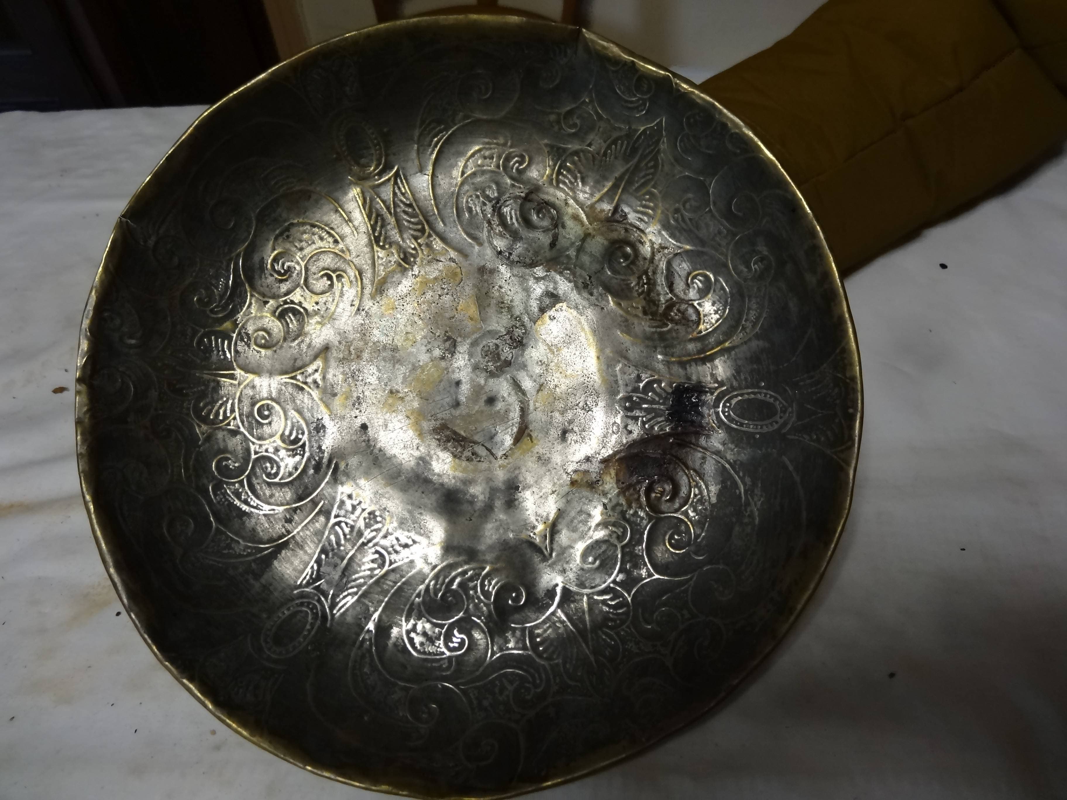 Plat circulaire, décor stylisé de motifs et grosses volutes.