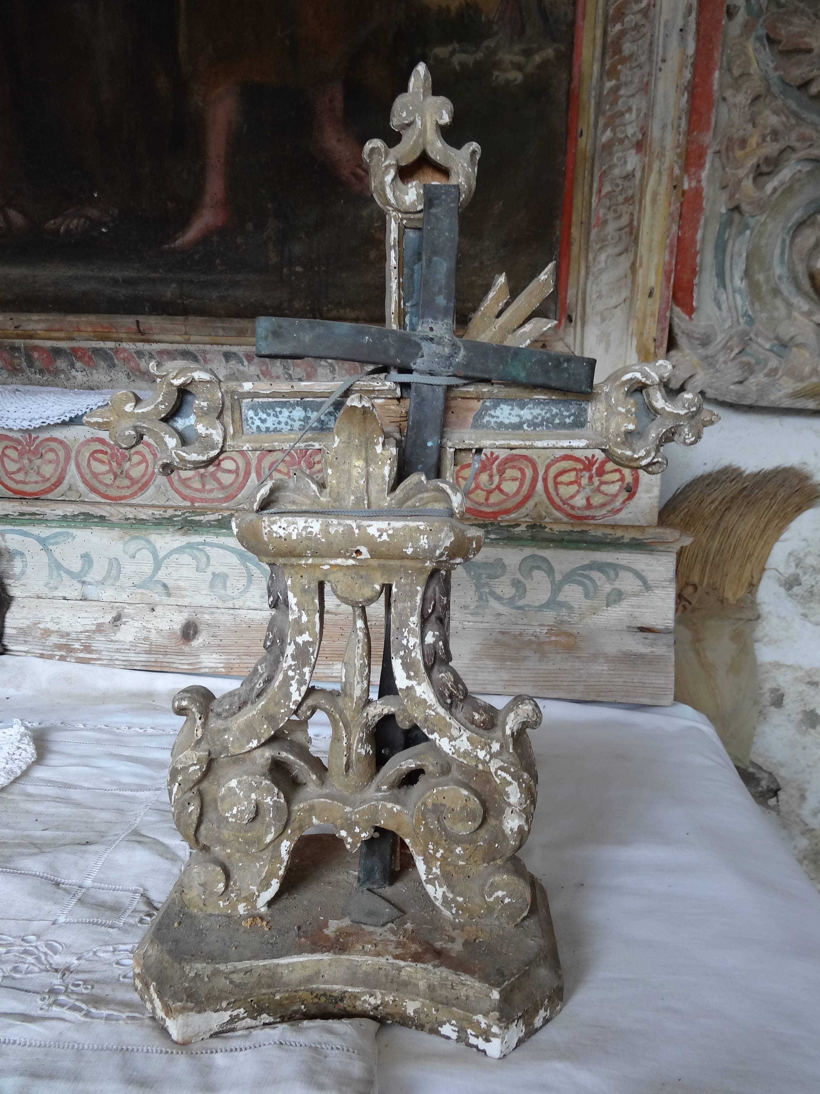socle pyramidal tripode, rehaussé de volutes, croix à embouts de style baroque