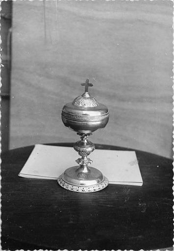 Porte gravée sur son socle l'inscription suivante : DONNE PAR LE CHAPITRE DU PUY PRIEUR SEIGNEUR D'ARLEBOSC 1657. Porte deux poinçons identiques sur son socle et un de même sur le coupe.