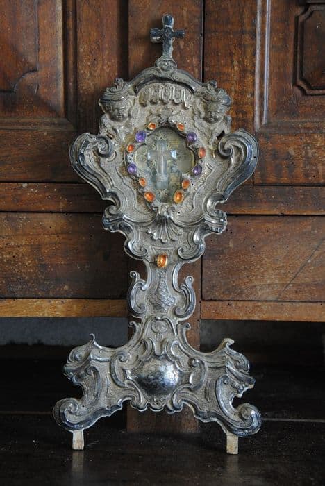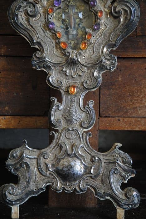 Reliquaire en argent repoussé sur âme de bois, verroterie.