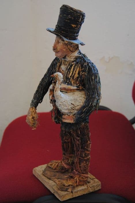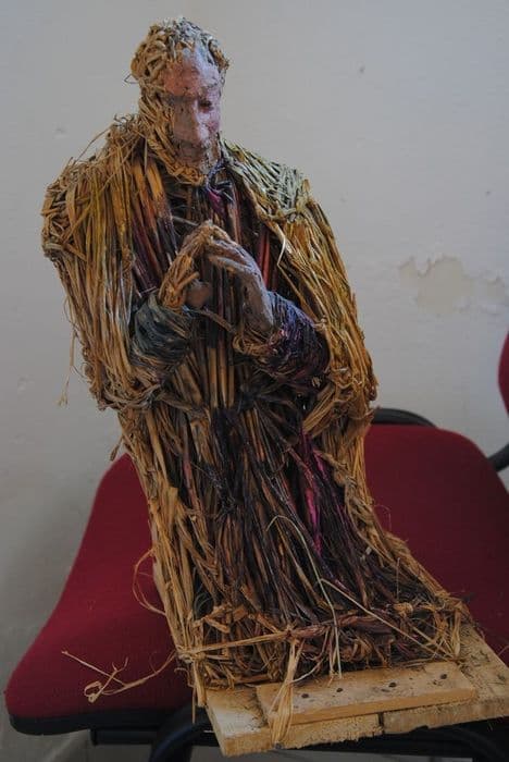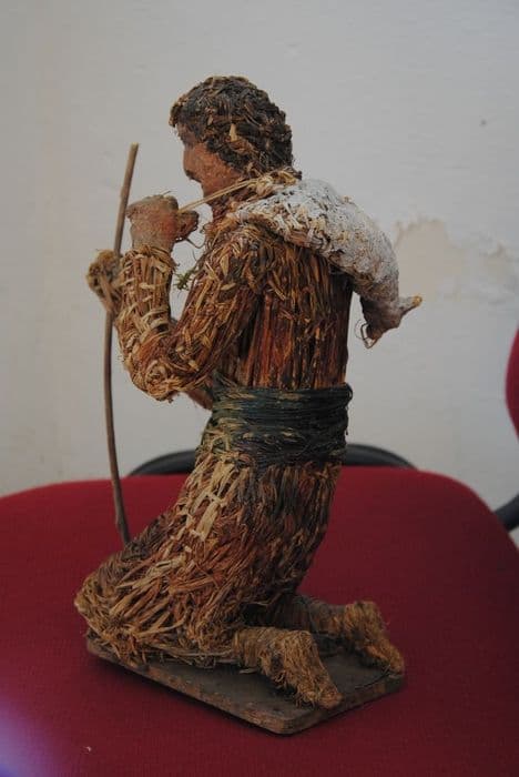 Crèche d'une quinzaine de personnages : berger, pêcheur, personnages de la vie quotidienne, roi mages montés sur des animaux... de 30 cm à 1 m de hauteur.