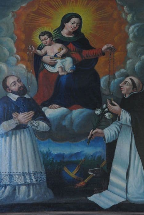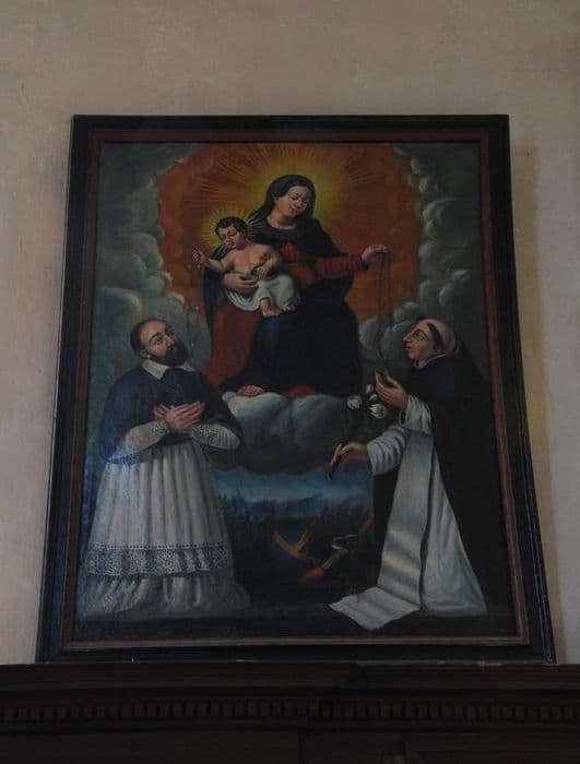 L'Enfant Jésus, dans les bras de sa mère, remet à saint Dominique de Guzman le rosaire tandis que saint François de Sales portant des fleur de lys se fait bénir par Marie.