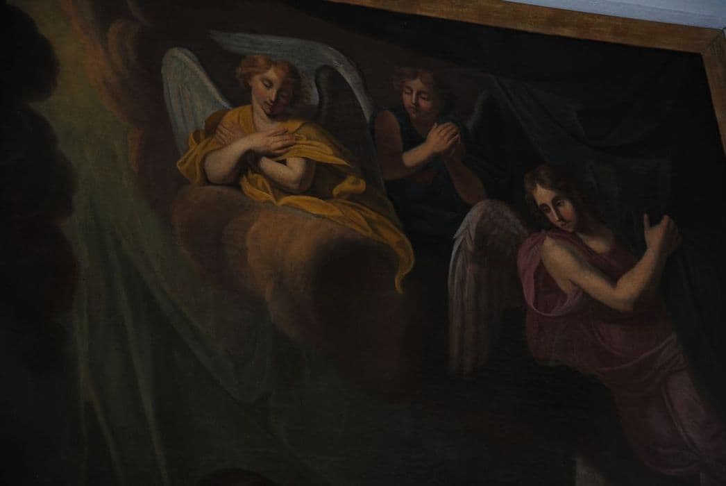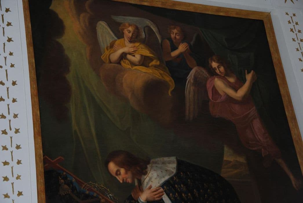 Saint Louis agenouillé, en prière, surmonté de trois figures d'anges.