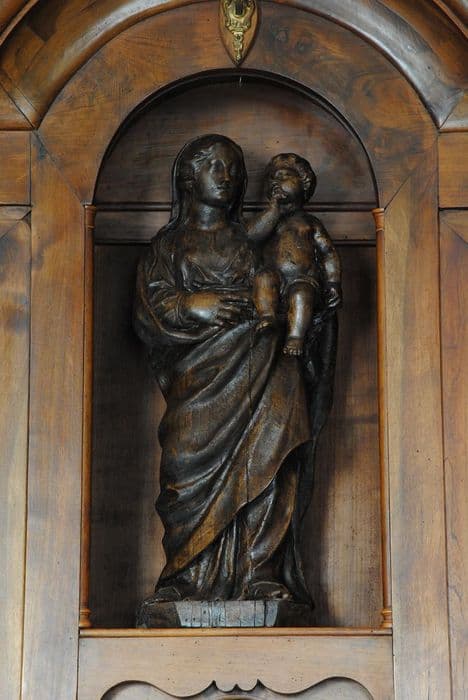 meuble de sacristie : crédence avec niche renfermant une statue de la Vierge à l'Enfant, le Christ en Croix, la Vierge à l'Enfant sur le globe