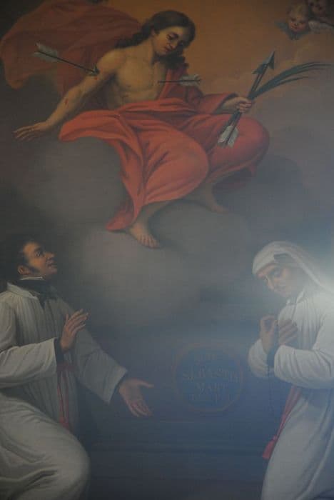 Le Christ est percé de flèches dans une gloire avec à ses pieds un religieux et une religieuse agenouillés, tous deux vêtus de blanc.