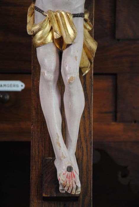 Christ replacé sur une croix récente avec socle en bois décapé.