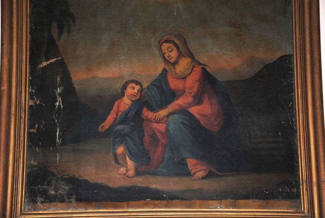 tableau : La Vierge et l'Enfant surmontée des Saints Coeurs de Jésus et de Marie