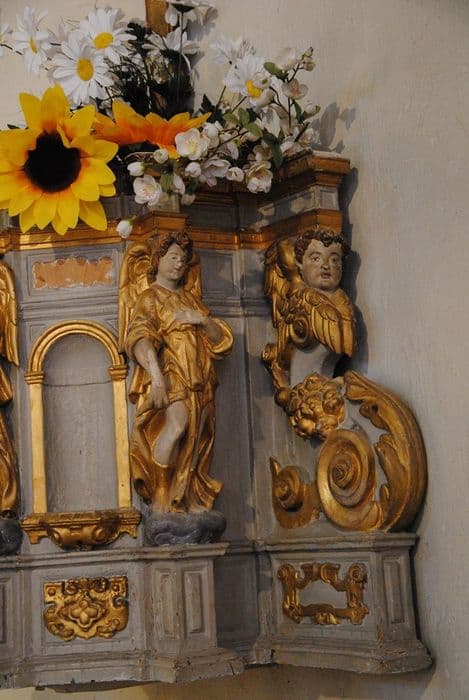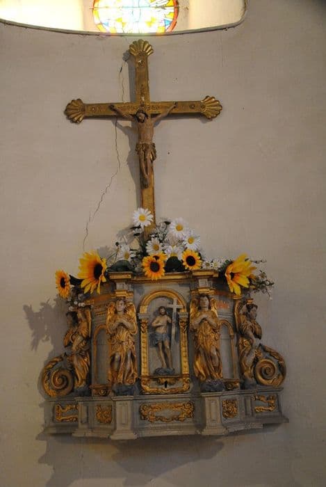 Cet ancien tabernacle a une porte ornée de la statue du Christ en Ecce Homo. ses pilastres sont formés d'anges-cariatides supportant l'entablement.