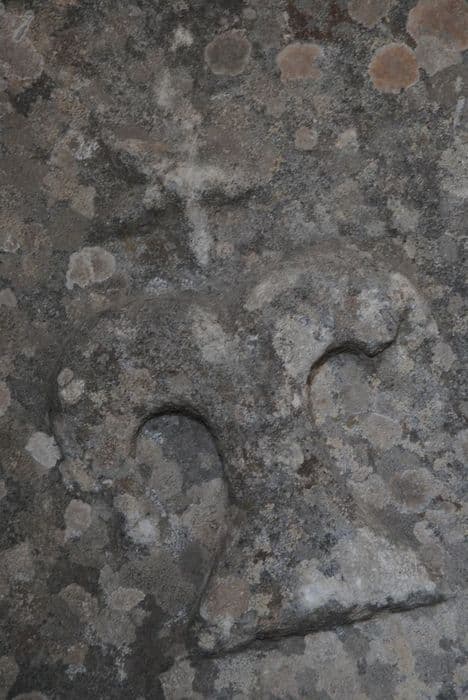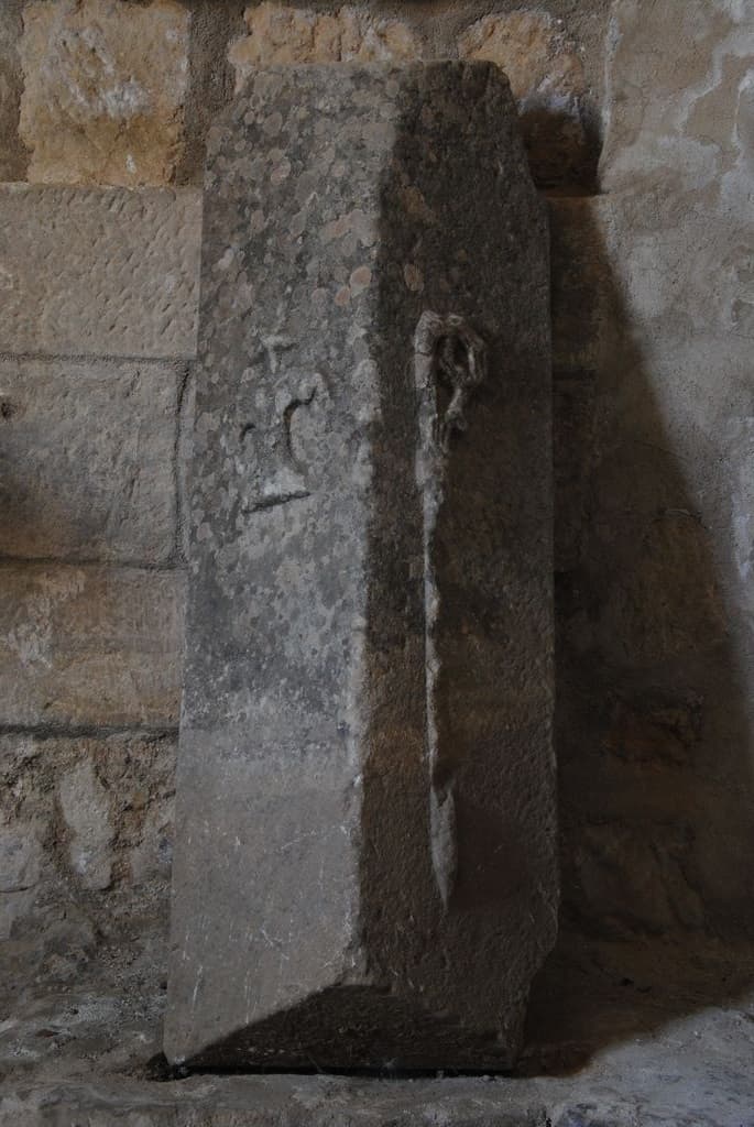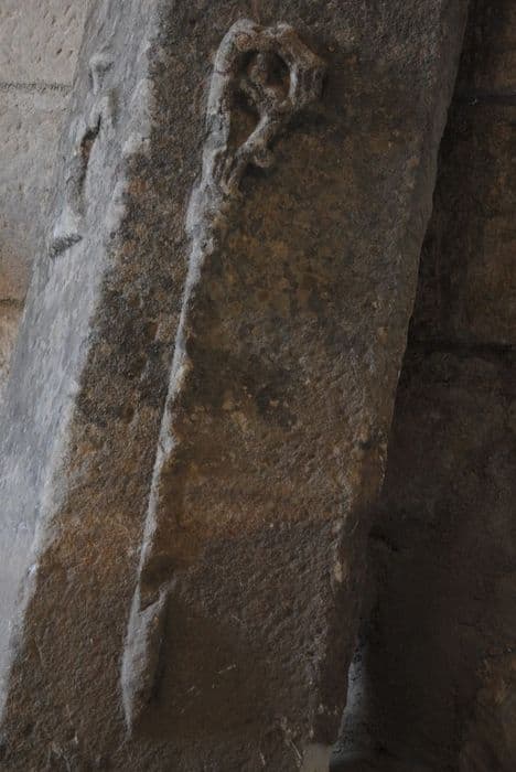 Couvercle de sarcophage placé contre le mur méridional de l'édifice décoré de deux motifs sculptés : la crosse sur le pan de droite et le roc d'échiquier sur le pan de gauche.