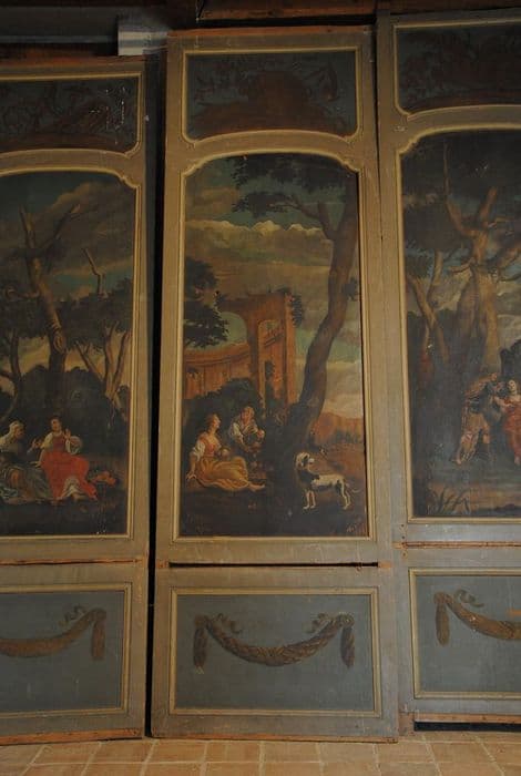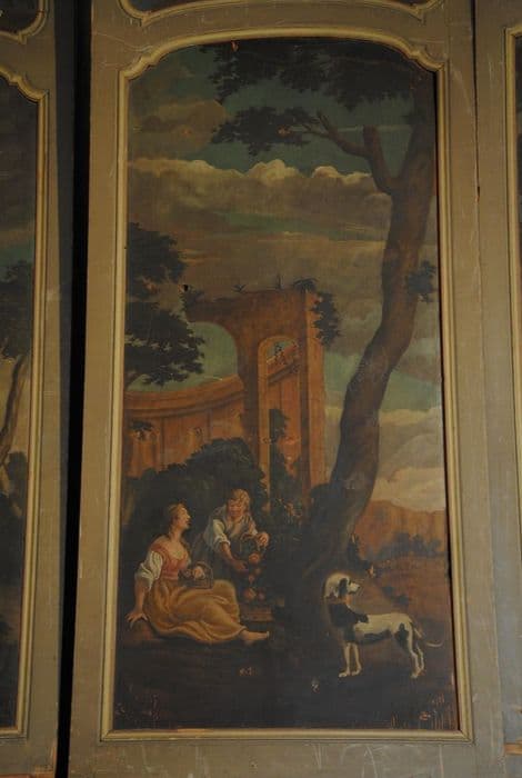 Panneaux peints en bois : un panneau simple et cinq panneaux doubles.