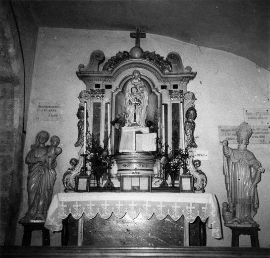 Sculpture en ronde bosse représentant sant Nicolas, debout, ayant à ses pieds les trois petits enfants dans le cuvier. Il fait le geste de bénédiction de la main droite, dans la main gauche, il tenait une crosse aujourd'hui disparue.