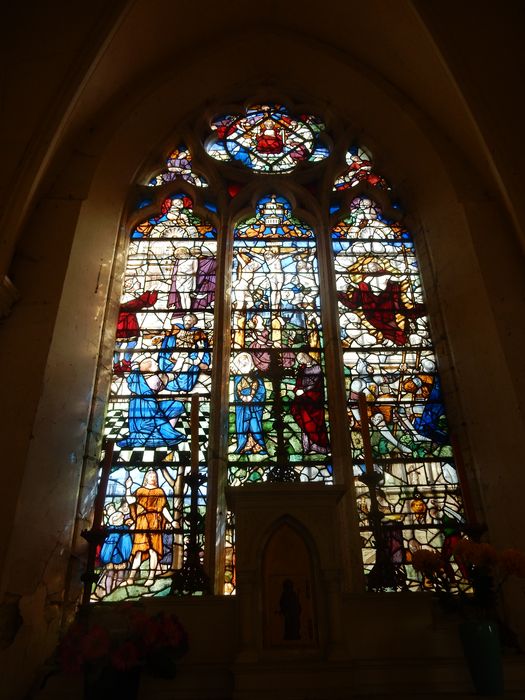 Les deux meneaux de la fenêtre se divisent en trois sujets de gauche à droite, représentant : la Flagellation du Christ, le Calvaire, l'Ascension et au-dessus, le Père éternel.