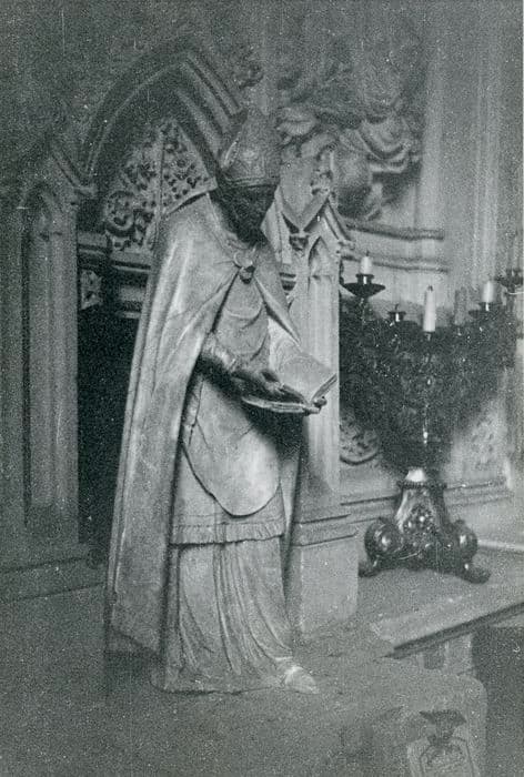 Statuette représentant un évêque sur une colonnette d'ordre ionique.