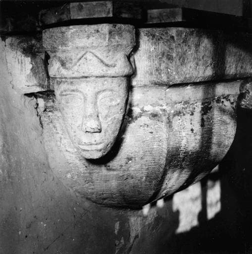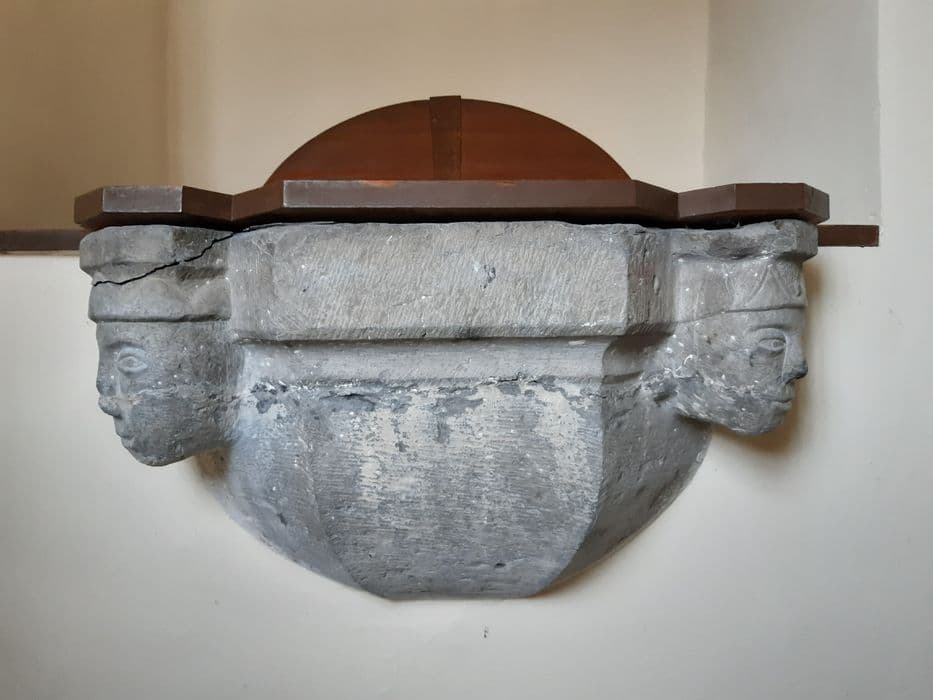 Cuve octogonale en pierre de givet, cantonnée de têtes d'angle individualisées, différentes les unes des autres.