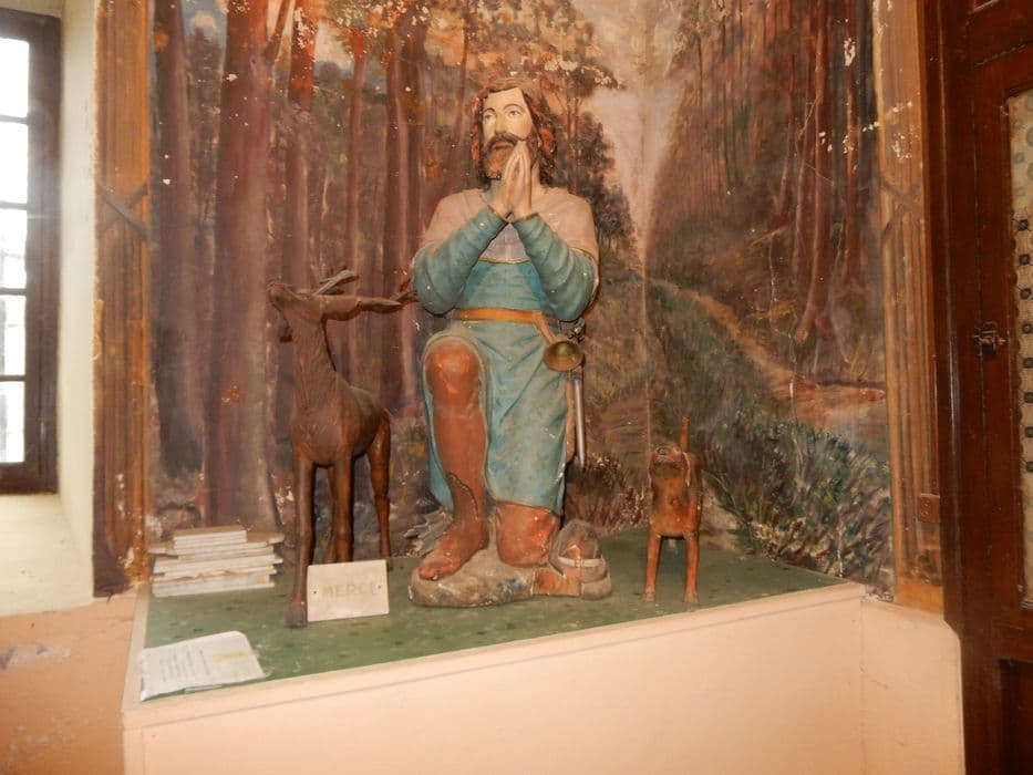 Saint Hubert se trouve à l'intérieur du premier porche donnant accès à l'église, le cerf et le chien se trouvent dans le clocher.