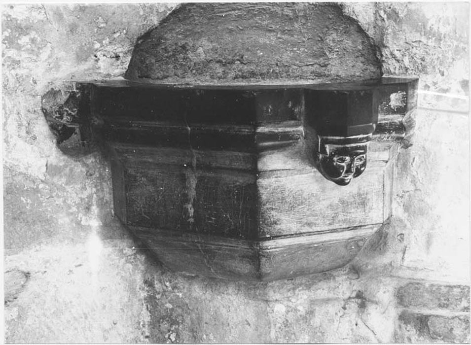 Bénitier en calcaire bleu, sans doute réemploi d'une cuve baptismale du 16e siècle.