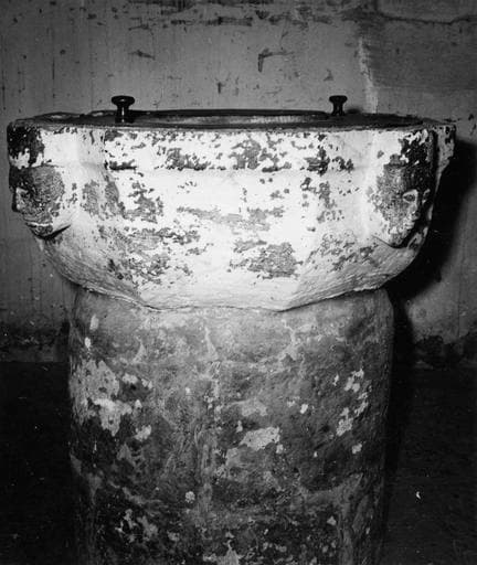 Cuve baptismale en pierre bleue peinte en blanc présentant quatre têtes d'angle semblables, dont l'une a été mutilée.