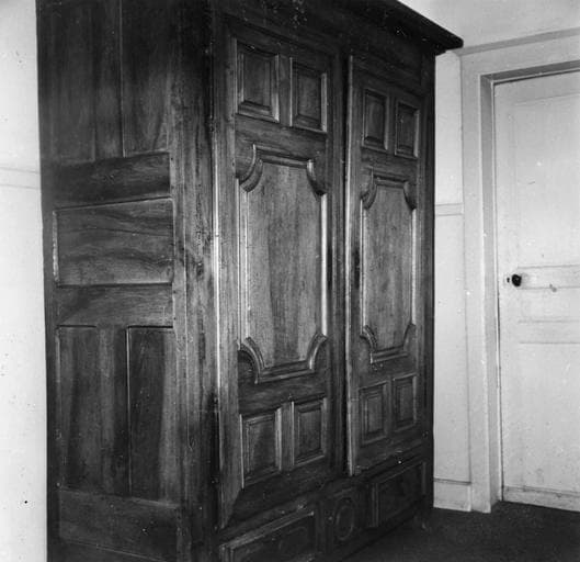 Armoire de style sobre aux portes moulurées, décor géométrique rectiligne.