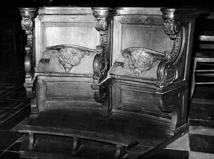 Bancs de stalles aux miséricordes sculptées de motifs d'inspiration végétale, toutes différentes les unes des autres. Cet ensemble mobilier comporte deux bancs d'angles de deux sièges chacun placés à l'entrée de la nef et de deux bancs droits composés de sept sièges chacun, soit au total 18 miséricordes sculptées. La balustre ajourée de ces deux bancs a été réalisée à une époque ultérieure à celle des stalles.