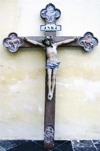Christ en croix en bois sculpté et polychromé. Les extrémités de la croix se terminent par des motifs quadrilobés, sculptés en bas relief des symboles des évangélistes (taureau, lion, aigle, l'ange étant sculpté au pied de la croix). Chacun tient un phylactère sur lequel figure le nom de l'évangéliste lui correspondant.