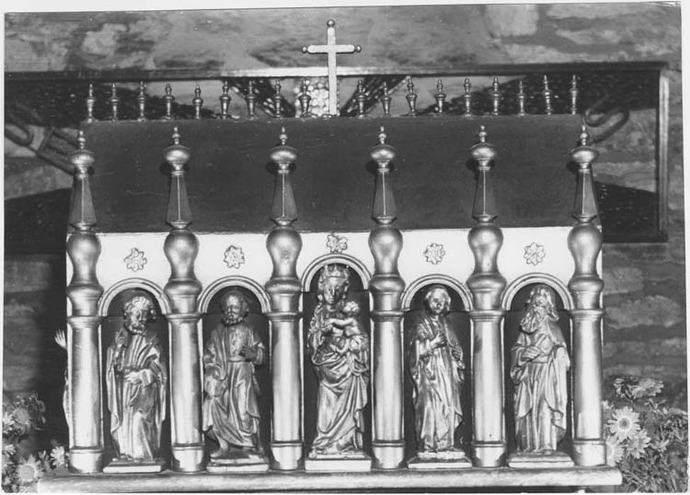 Onze personnages en pied (les Apôtres ?) entourent la Vierge à l'Enfant.