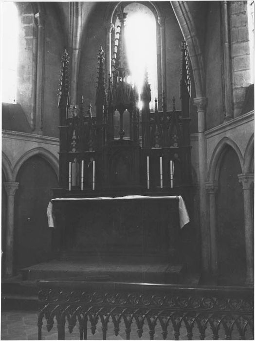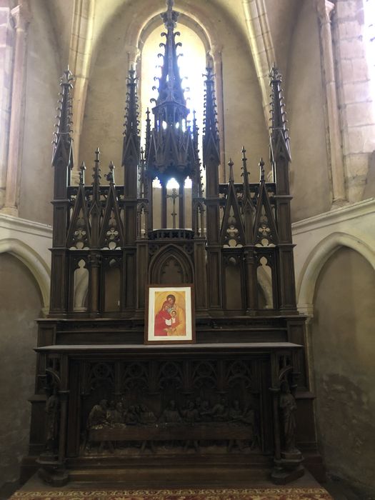 Autel en chêne ciré de style néo-gothique. Le devant d'autel présente une scène en bas-relief encadrée de deux statuettes aux angles, en biseau. Tabernacle à porte en arc brisé surmonté d'une haute exposition ouverte montée sur de fines colonnettes qui supportent une flèche ajourée. Les panneaux encadrant le tabernacle sont ajourés de deux lancettes à gâbles étroits et flèche au centre. Quatre hautes colonnettes carrées à pinacles rythment le retable.