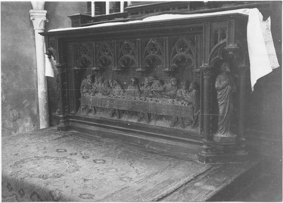 Devant d'autel présentant la Cène. Les statuettes du devant d'autel figurent saint Pierre et saint Paul, en pied.
