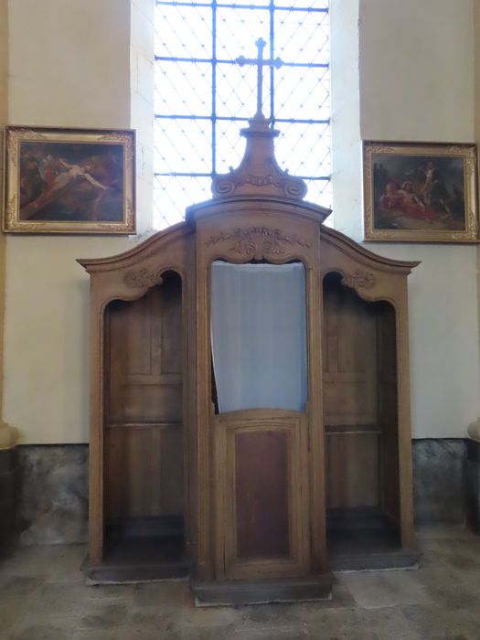 Confessionnal à trois loges. Loges latérales plus basses et ouvertes. La porte de la loge centrale fermée en partie basse et comportant une grande ouverture en plein cintre dans la partie haute.