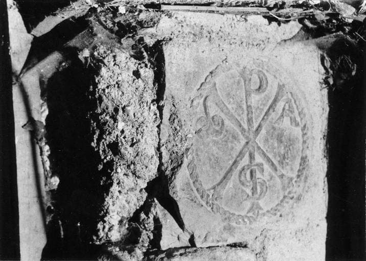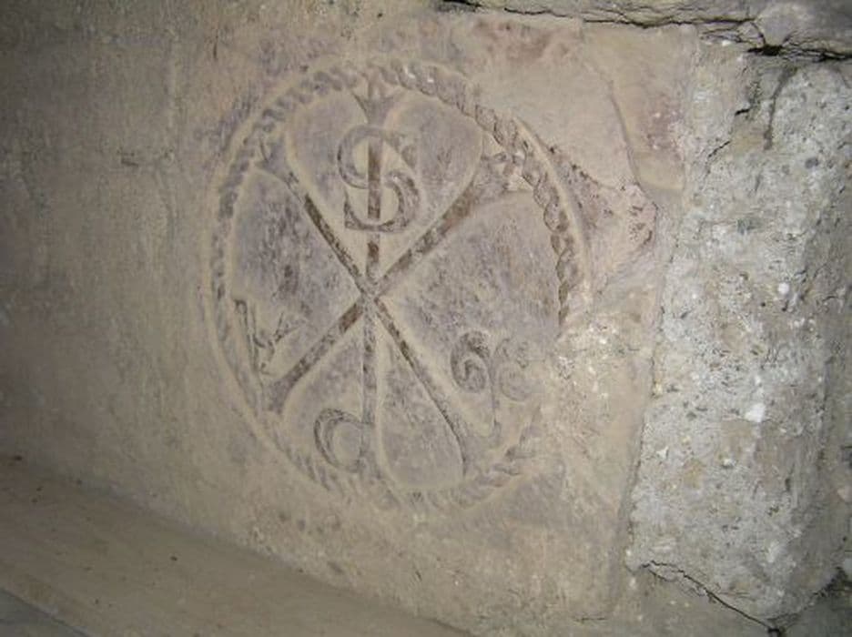 Chrisme scellé au-dessus de la porte d'entrée dans le porche, mais la porte romane est maintenant incluse dans la chapelle et le chrisme est caché dans l'escalier de la tribune. A noter que la pierre a été scéllée à l'envers.