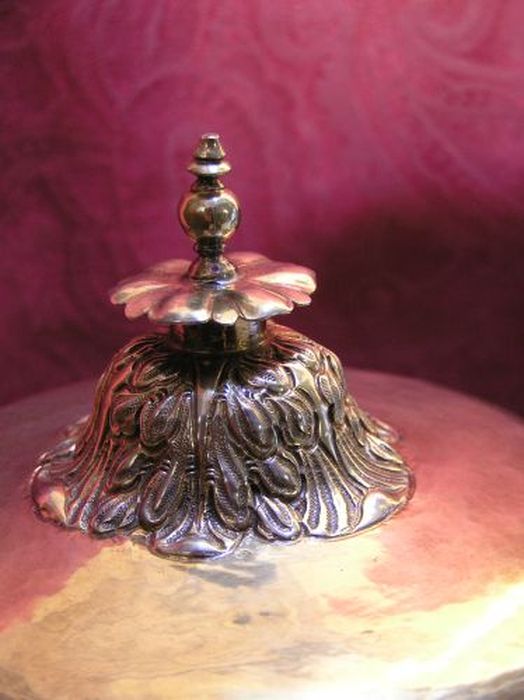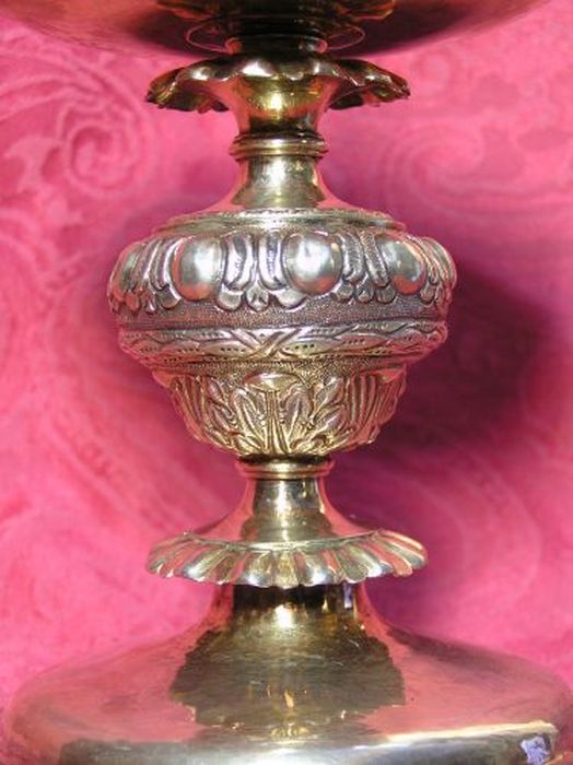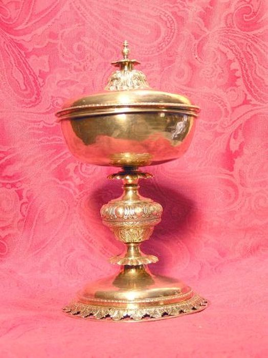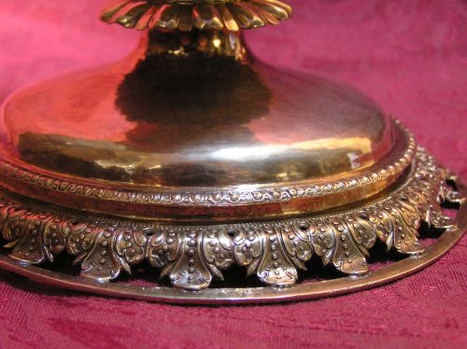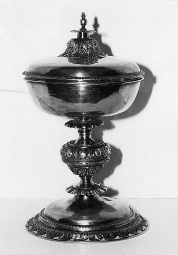 Pied à décor ajouré, noeud à oves, couvercle orné de feuilles autour du bouton et croix absente.