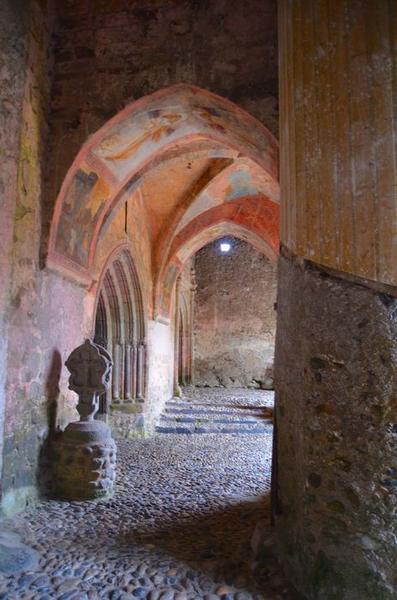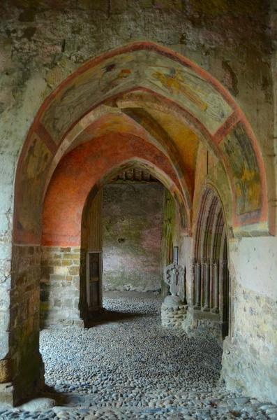 La répartition des fresques s'organise sur chaque arceau en deux grands panneaux d'anges musiciens et de saints ; sous ces deux grandes figures, des panneaux plus petits et de facture différente contiennent des ex-voto. Ils sont entourés d'un cadre ocre-rouge orné de rosettes quadrilobées noires. Saint Jean-Baptiste est représenté amégri pieds et bras nus, il est drapé dans un manteau brun et porte une tunique en beau brun-rouge foncé. Il tient un livre dans la main gauche sur lequel sur trouve l'agneau portant le nimbe crucifère et la croix de résurrection ornée de l'oriflamme. Il montre de la main droite l'agneau divin. Saint Jacques de Compostelle se présente sous l'habit de pélerin, les pieds nus. Il tient dans sa main gauche un long bourdon et un livre dans sa main droite. Il est coiffé d'un feutre brun foncé avec une coquille cousue sur le devant. Plusieurs anges musiciens, l'un joue du rebec, le deuxième de la harpe, le troisième de la guiterne, le dernier de la flûte. Ex-voto de l'enfant malade : la scène se déroule en plusieurs temps, un enfant malade couché dans un lit est veillé par sa mère. Dans la partie inférieure, les deux personnages sont en prière face au santuaire de Notre-Dame-de-Tramesaygues, ils offrent un cierge en reconnaissance de la guérison de l'enfant. Ex-voto du prisonnier : dans une prison crénelée, un homme a les pieds liés, il prie. Il est revêtu d'un pourpoint gris rose à collet ocre. Le personnage franchit ensuite la tour par une porte, ayant retrouvé sa liberté, il remercie la madone à genoux, les mains jointes tenant ses fers. Ex-voto de la chute de l'arbre : un enfant chute d'un arbre, sa mère à genoux offre un cierge à la Vierge. Ex-voto de l'assassinat : un homme enfonce son épée ou sa dague dans le corps d'un personnage sans défense. Le meurtrier tenant son arme entre ensuite dans un château féodal. Dans le bas du panneau, il semble implorer le pardon de ce crime, il est agenouillé devant le sanctuaire, les mains jointes. Ses vêtements sont ceux d'un gentilhomme du Moyen-Age : coiffe claire surmontée d'un feutre relevé sur la nuque et baissé sur le front. Pourpoint brun festonné, cintré à la taille. Jambes moulées dans des chausses. Le buste est recouvert d'une cotte sans manches. Ex voto du duel : au cours d'un affrontement, le blessé remercie à genoux la Vierge de l'avoir sauvé de la mort. Le fer de la lance est toujours plongé dans sa poitrine. Le personnage portant la lance est habillé d'un pourpoint armé recouvert partiellement par une tunique brune. Il est coiffé d'un couvre-chef rouge assemblée en turban. Il est chaussé de poulaines grises et porte des chausses brun rouge. Sa victime a le bras droit replié sur sa poitrine blessée et il tient toujours de sa main gauche son arme inutile. Ex-voto de l'homme malade : un homme est allongé sur son lit en proie à une hémorragie nasale. Dans la partie basse, ce même homme est à genoux, tenant un cierge, pour remercier la Vierge de sa guérison.