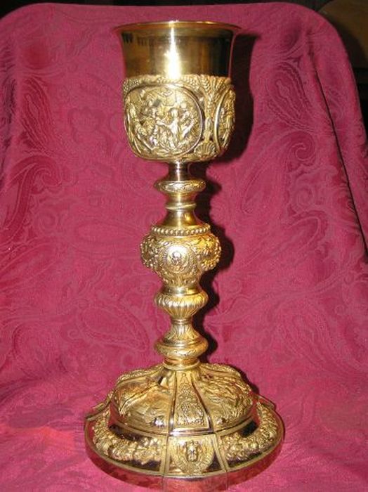 Grand calice à trois médaillons à la coupe, au coeur et au pied. Sur la coupe : Ecce Homo, portement de croix et Mise au tombeau. Noeud : trois petits médaillons, Christ, Vierge, Saint Joseph reliés par des guirlandes de fleurs. Pied : Christ en croix, Nativité et Mise au tombeau. Sur la patène : Déposition de croix.