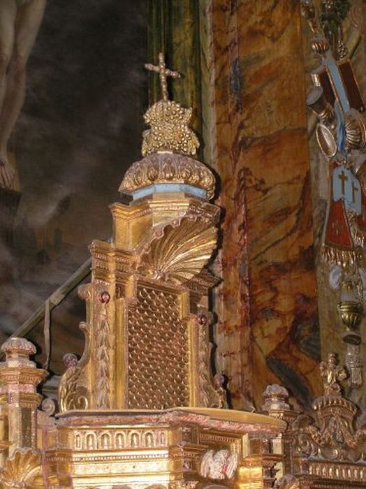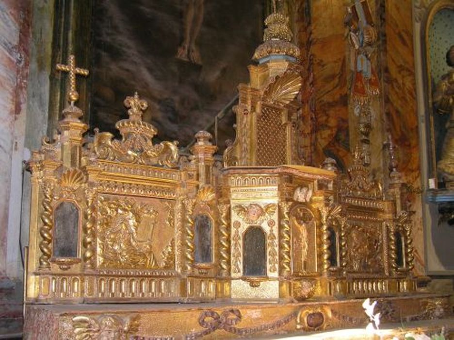 Petit retable. tabernacle (à ailes) central dont les deux côtés présentent une console où se dressent deux statuettes, puis deux panneaux, un de chaque côté, encadrés chacun par des statuettes sur consoles. Ce qui porte à six le nombre des statuettes en bois doré, plus un personnage au-dessus du tabernacle, aujourd'hui disparu mais que nous pensons être celui retrouvé à la sacristie. Les niches sont encadrées de colonnettes torsadées, le tout est surmonté d'une galerie de balustres.