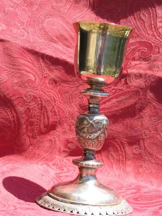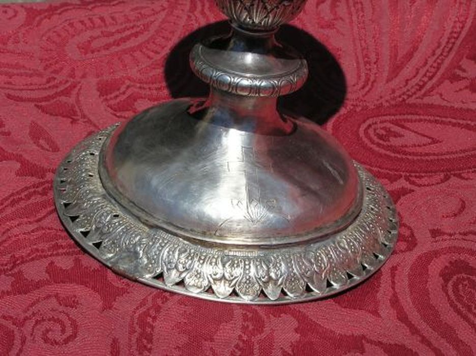 Calice en argent, coupe en vermeil, pied à bordure ajourée, noeud à guirlandes.