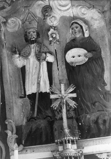 Maître-autel, tabernacle et son dais et retable, en bois peint de couleurs vives et arc triomphal. Tableau central du retable remplaçant un panneau du retable en bois doré et représentant Sainte Lucie et Saint Lizier.