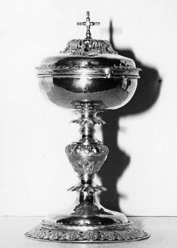 Petit ciboire à pied à bordure ajourée, noeud à oves, décor perlé. 4 poinçons mals insculpés (dont un de ville et un de maître).